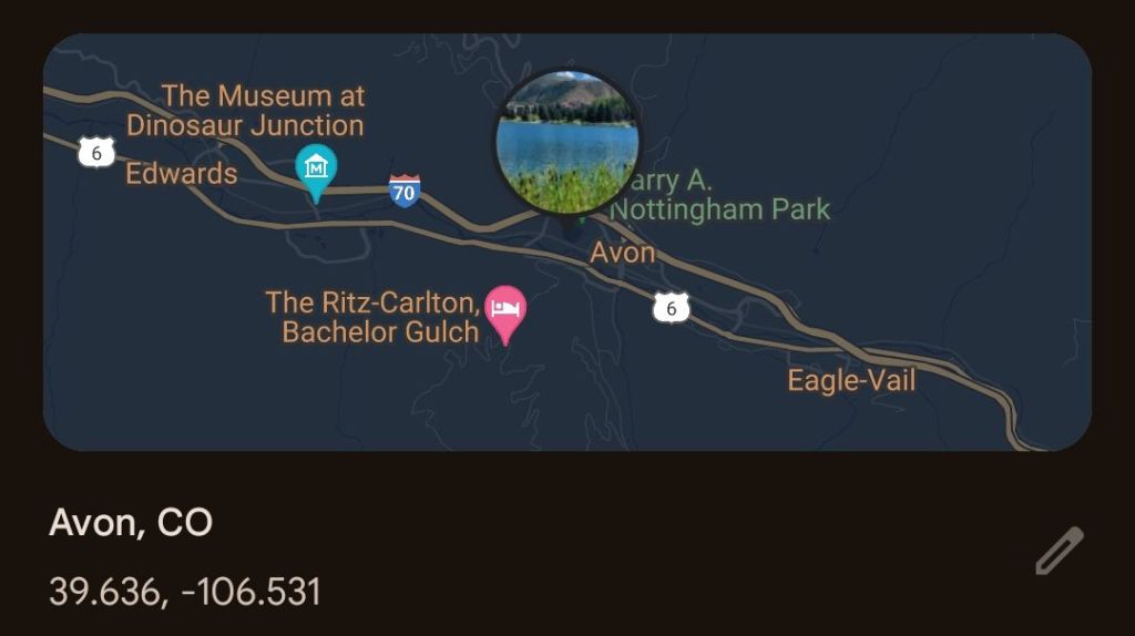 We’ve been staying with my son, who lives and works here in Avon, Colorado. I have to say, this place is calling to me. If only I didn’t have a gig back east, it might just be the perfect spot to hang my hat—maybe even for retirement.The air is clean, the walking paths are well-maintained, and the community offers a ton of amenities.