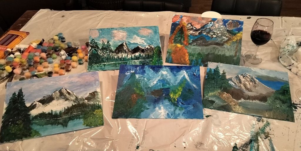 In the background is the soft spoken Bob Ross, encouraging us onward about what brush or scraper to use, what paints to mix and how to blend to create water ripples, mountain scapes, and happy trees. Bob is attributed to have said. “‘We don’t laugh because we feel good, we feel good because we laugh.” We obviously had a load of fun and a lot of laughs and we felt good.