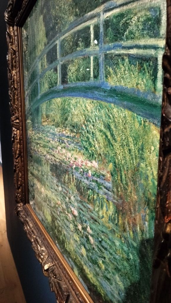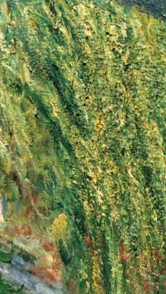 I noticed folks getting closer to the painting, so I took that as my cue. There were no ropes around this piece. As I approached, something became immediately clear: this painting was not at all as smooth as it appeared from a distance. I took a photo (you’re allowed, as long as you don’t use a flash!). The surface was full of paint—thick layers upon thick layers. The technical term, I learned from watching Baumgartner Restoration YouTube videos, is “impasto.” Monet was very generous with his paint! You could lose yourself in the textures and colors. Taking a photo that captured the impasto was tricky—I tried from various angles until a friendly guard encouraged me to step back.
