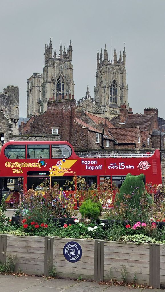 We’ve strolled through the Shambles, walked its ancient walls, and visited Clifford’s Tower. We’ve toured the Jorvik Viking exhibit, a multisensory experience that takes you through a reenactment of a Viking village, discovered and unearthed during city construction. We’ve even taken a cruise on the River Ouse (pronounced “ooz”) and attended a reenactment of the Viking invasion. This consisted of a Viking-ish boat, complete with a serpent head and tail, a robust lady in a horned helmet, her leather-clad partner bearing a sword, shield, and helmet, and a few rowers. Needless to say, York seemed safe from a second invasion!