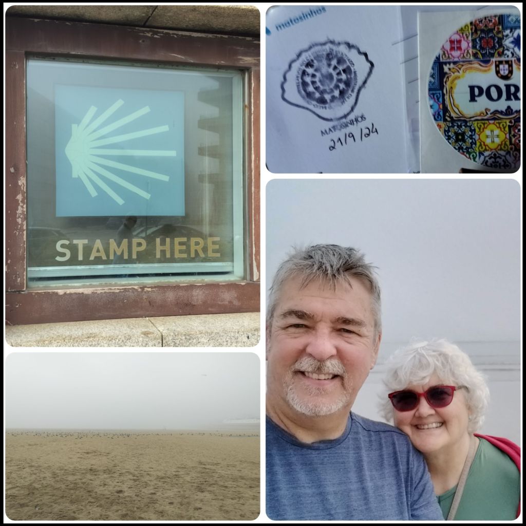 On the morning of our second day, we went to Matosinhos Beach, which is a portion of the Portuguese Coastal walk. A visitor center provided an opportunity for pilgrims to get their Camino Passport stamped. We collect our passport at the first hotel, which is still a day out, so I purchased a postcard and the clerk was nice enough to stamp it. While “not official,” it is the first of the stamps we will collect in the days ahead. The weather was foggy and the tide was way out, so it took a while to get a few photos of the Atlantic Ocean. A few years ago, Jacki and I visited Ocean City Beach, and when we looked at the latitude, it closely aligned with Portugal. Now, we were on the other side of the Atlantic. Who knew then that we would be here now? We enjoyed an espresso at the local café on the beach and then headed back to Porto to continue our sightseeing.